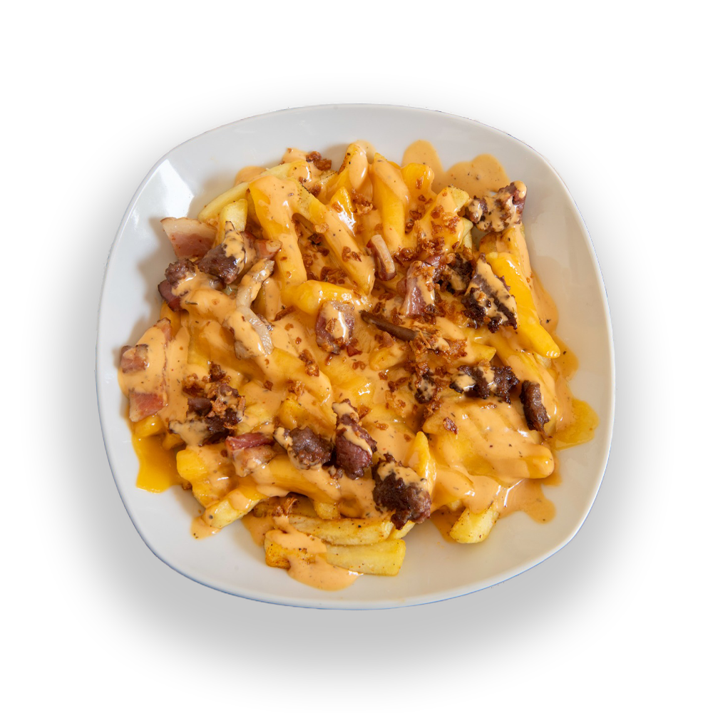 NEW YORK FRIES Deliciosas patatas fritas con carne picada devaca rosa, cebolla crujiente, bacon ahumado,cheddar madurado 100% natural y salsa secreta de la casa. 9.50€